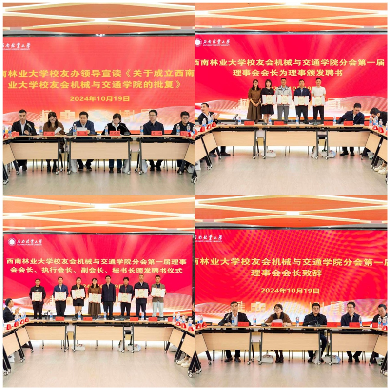 李军宣读了《关于同意成立西南林业大学校友会机械与交通学院分会的批复》。简峰为当选的分会会长、副会长、秘书长颁发聘书,当选的分会会长李玮为理事会理事颁发聘书。李玮提出分会未来将从“加强校友联络、促进校友合作、传承西林精神、服务社会进步”四个方面开展工作,勉励校友们共同将分会打造成为大家温馨的家园,成为推动学校和学院发展的重要力量。