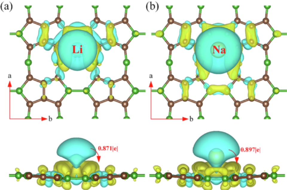 图3 k-C6B4与Li (a)、Na (b)间的电荷密度的差异